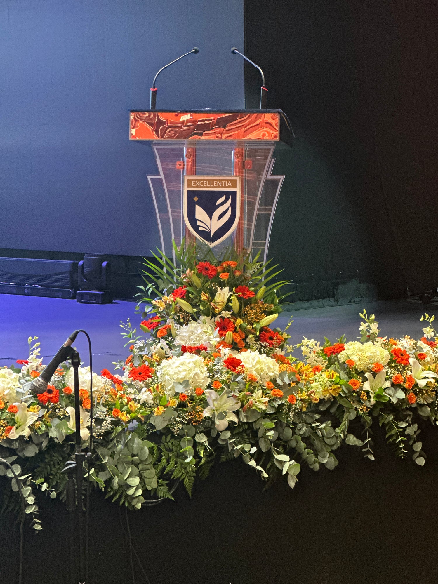 From elegant floral borders that frame the platform to stunning podium arrangements and cascading florals around the backdrop, every detail is designed for visual impact.